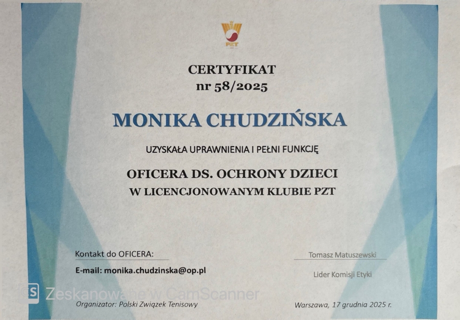 Trenerka Monika Chudzińska uzyskała uprawnienie i pełni funkcje Oficera do spraw Ochrony Dzieci w Licencjonowanym Klubie PZT UKS Nyska Szkoła Tenisa.